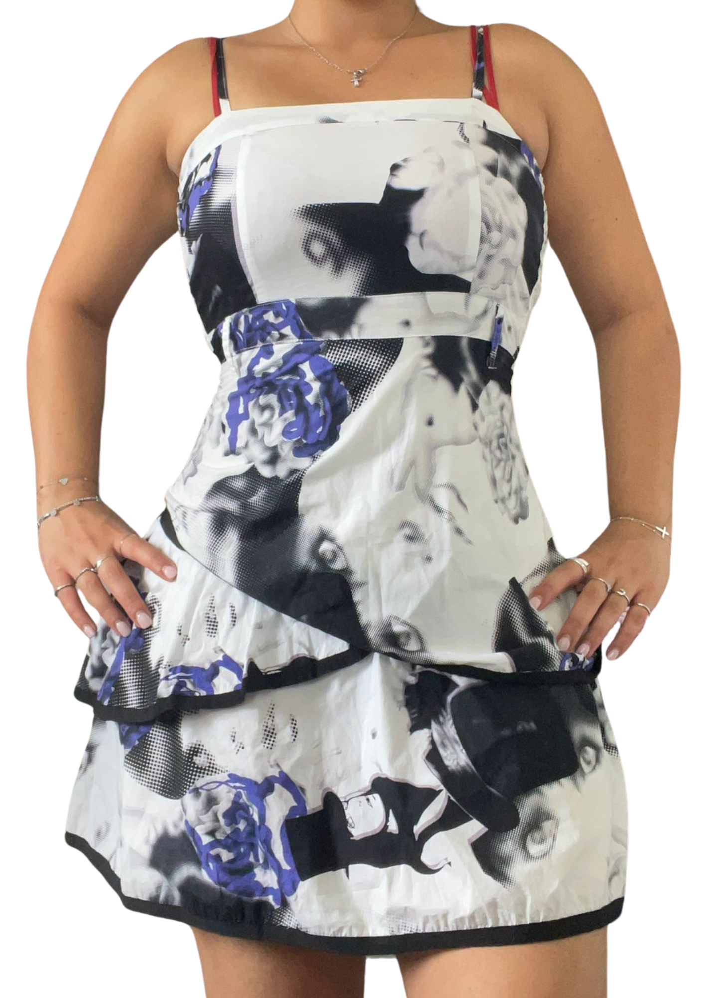 Bold and eye-catching mini dress featuring a black-and-white graphic print with touches of blue. Designed with thin straps, a fitted bodice, and a tiered ruffle skirt for a playful silhouette. Lightweight, stylish, and perfect for standout summer or party looks. Size L.