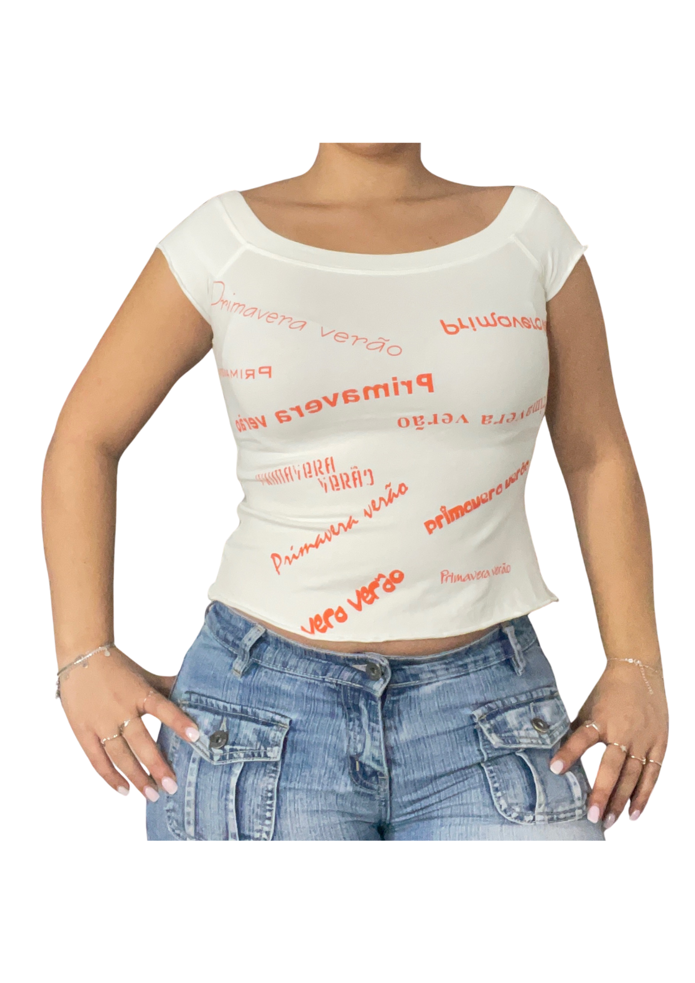 A fitted white baby tee with red all-over “Primavera Verão” prints. Featuring short sleeves and a playful retro vibe, perfect for a bold Y2K-inspired look.